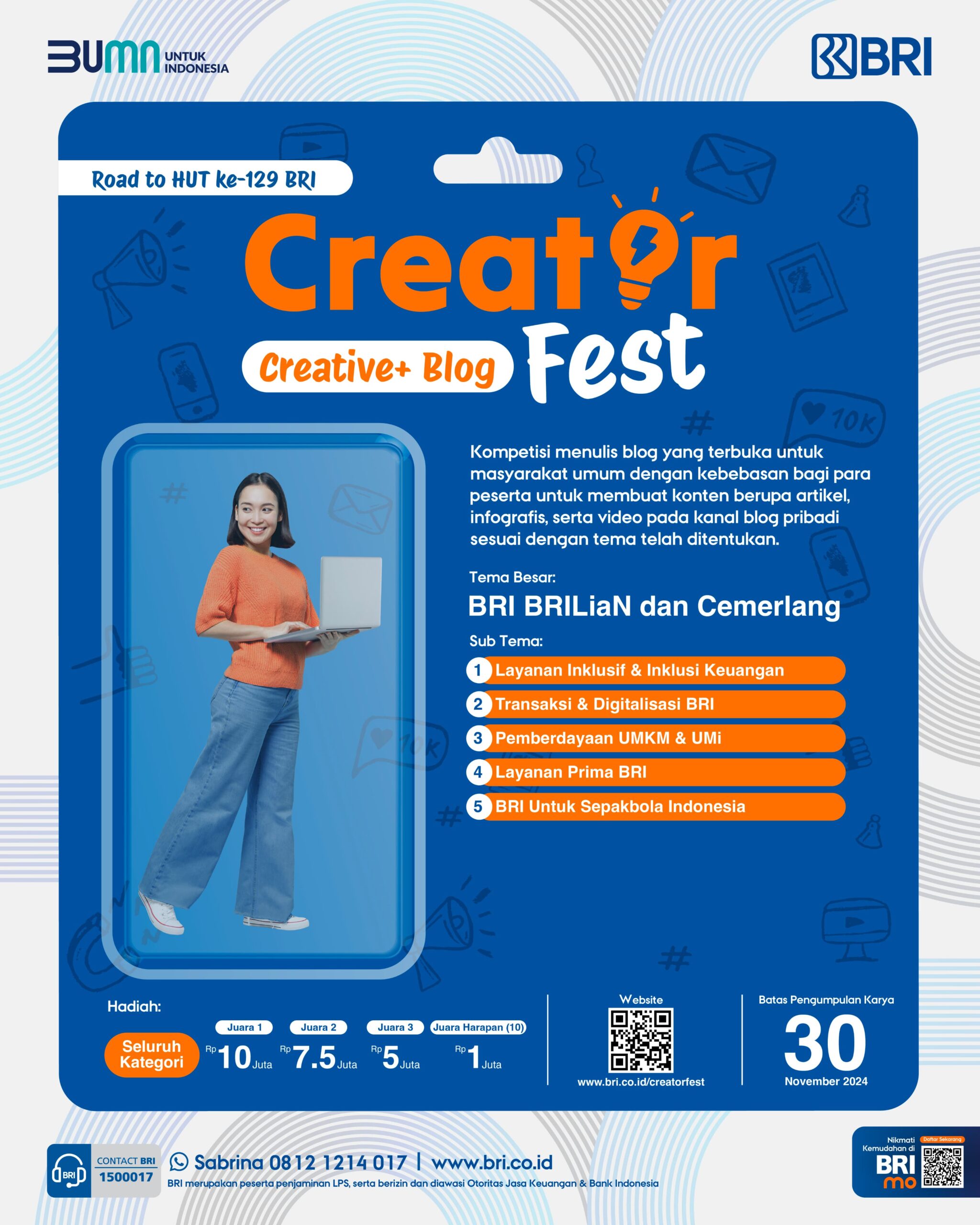“Kompetisi ini diharapkan dapat mendorong semangat kreatif para peserta, memperkuat keterlibatan masyarakat dengan BRI, dan menciptakan dampak positif yang sejalan dengan visi BRI untuk terus berkembang sebagai bank yang inovatif dan berdampak bagi masyarakat Indonesia,” imbuhnya.